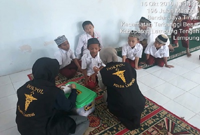 LAMPUNG TENGAH, BangkitNusantara.com. – Mewakili Kapolres Lampung Tengah AKBP I Made Rasma, S.Ik, M.Si Paurkes Bripka Ucida, S.KM mengadakan pengobatan gratis di Panti Asuhan Yayasan Al Marhamah Bandar Jaya Barat Kec Terbanggi Besar Lampung Tengah, Selasa (15/10/2019) jam 10.00 WIB.