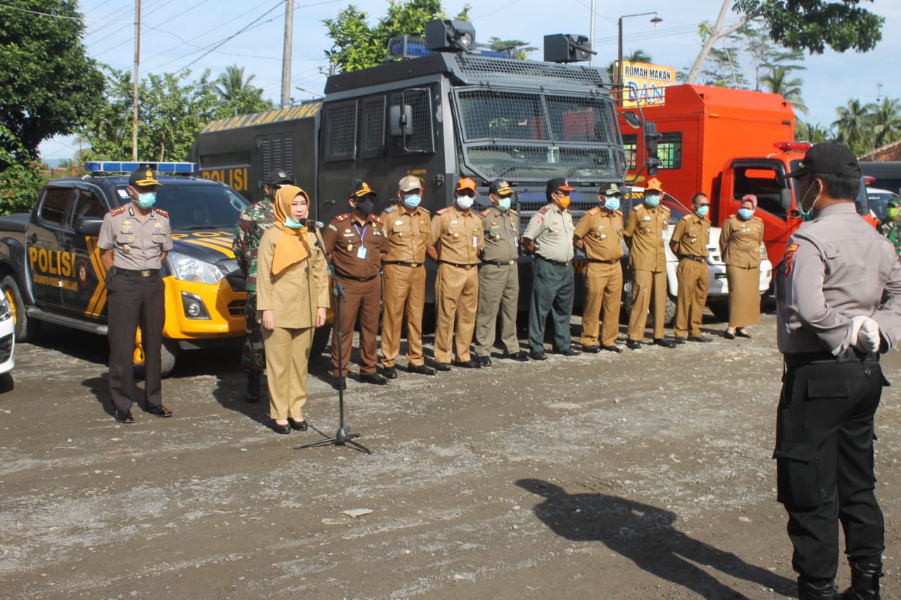 TANGGAMUS.Bangkitnusantara.com. —Bupati Hj. Dewi Handajani, SE.MM., memimpin langsung Apel Gabungan yang terdiri unsur TNI, Polri, Sat Pol PP, Dinas Kesehatan, BPBD dan Damkar Kabupaten Tanggamus di depan Halaman Warung Makan Dani Pugung, Selasa (31/03).