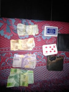 Dan barang bukti yang berhasil diamankan dilokasi Uang Tunai Sebesar Rp. 166.000 (seratus enam puluh enam ribu), 2 set kartu remi, serta 1 buah ambal warna merah bergambar yang di gunakan sebagai alas.