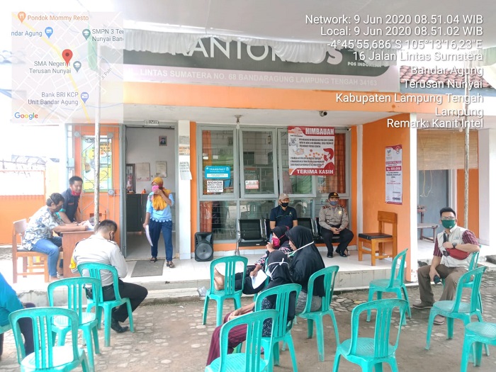 Pengamanan Bantuan Sosial Tunai (BLT) sesuai Prosedur Covid 19 oleh personil Polsek Terusan Nunyai, Sat Pol PP Kecamatan Terusan Nunyai serta Bhabinsa Kec Terusan Nunyai dengan jumlah penerima bantuan Kecamatan Terusan Nunyai sebanyak 596 Kepala Keluarga dan Kecamatan Way Pengubuan (Kampung Lempuyang Bandar) sebanyak 154 Kepala Keluarga dan Per Kepala keluarga mendapatkan Rp 600.000.- ujar Santoso.