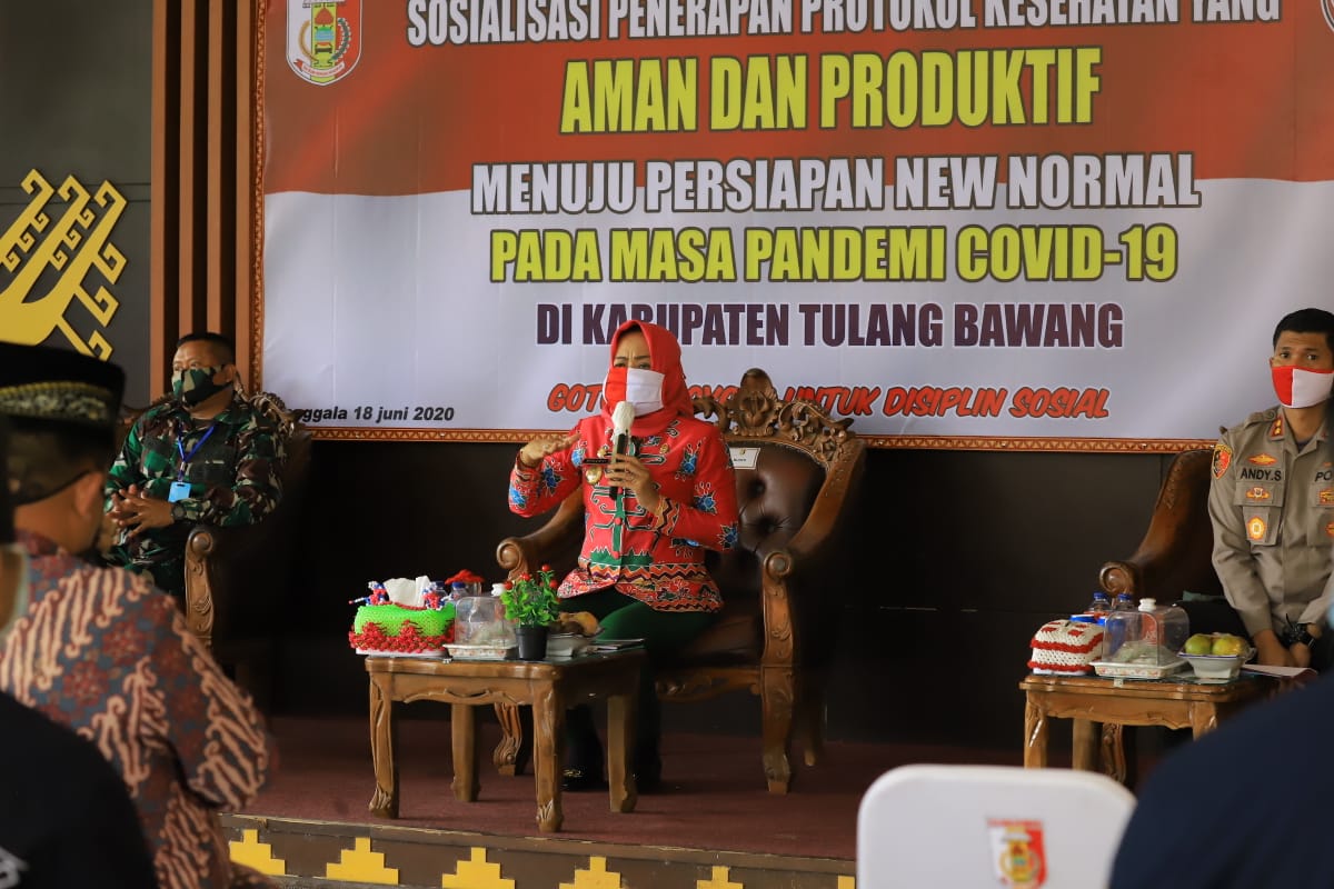 TULANG BAWANG. Bangkitnusantara.com. — Sebagai langkah awal untuk mempersatukan semangat kebersamaan, bergotong royong dalam Bergerak Melayani Warga (BMW) guna mewujudkan tatanan New Normal di Kabupaten Tulangbawang, Bupati Hj. Winarti SE MH memimpin sosialisasi penerapan protokol kesehatan yang aman dan produktif, Menggala, Kamis (18/06/2020).