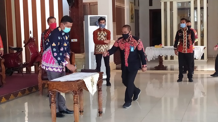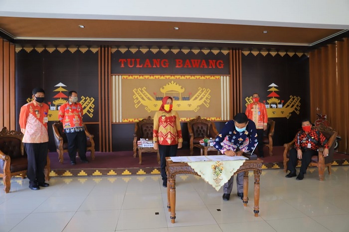Penyerahan laporan hasil pemeriksaan terhadap laporan keuangan Pemkab Tulang Bawang, Pemkab Lampung Tengah dan Pemkab Pringsewu tahun anggaran 2019 dilakukan secara virtual di masa pandemi Covid- 19, di rumah Jabatan Bupati, Jalan Cendana, Kelurahan Menggala Selatan, Kecamatan Menggala, Kabupaten Tulang Bawang, selasa (23/06/2020).
