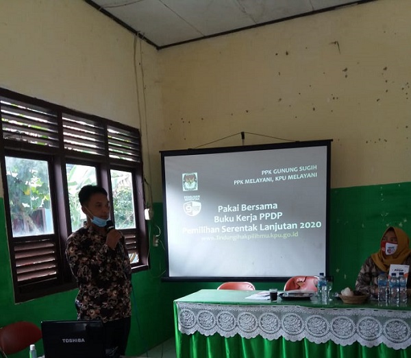 Arahan Ketua PPK Dwica Sukma dalam menyampaikan pelaksanaan kegiatan bimtek tersebut Rakor Bimbingan Tehnis PPS tentang cara kerja PPDP dan Rekapitulasi data pemilih tingkat panitia pemungutan suara pada pemilihan Bupati dan Wakil Bupati Kab Lampung Tengah tahun 2020 PPK Kecamatan Gunung Sugih bahwa masih menghadapi dalam situasi pandemi Covid-19 maka pelaksanaannya di laksanakan secara mematuhi Protokol Kesehatan Pemerintah.