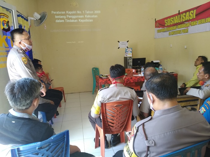 Lampung Tengah, Bangkitnusantara.com — Waka Polres Lampung Tengah Kompol Suparman, S.Pd. M.Si mewakili Kapolres Lampung Tengah AKBP Popon Ardianto Sunggoro, S.lk., S.H melakukan Sosialisasi Perkap 01 tahun 2009 tentang Penggunaan Kekuatan dalam tindakan Kepolisian bertempat di Aula Gedung SPK Polsek Gunung Sugih Kec Gunung Sugih Lampung Tengah, Selasa (21/07/2020).
