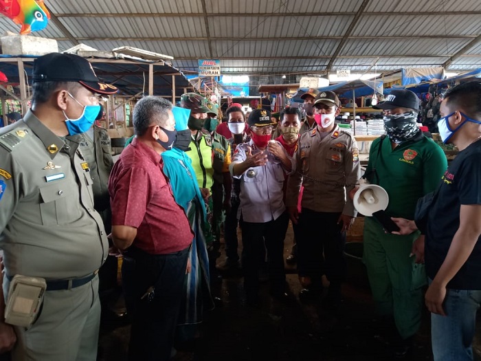 Lampung Tengah. Bangkitnusantara.com — Kapolsek Punggur Iptu Amsar, S.Sos Bersama Camat Kota Gajah Muliwan Sp.MM, Bhabinsa Kota Gajah Timur Pelda Joko, S Memberikan himbauan tentang Kebiasaan atau tatanan baru (New Normal) Pasca Covid-19 di Pasar Kampung Kota Gajah Timur Kecamatan Kota Gajah lampung Tengah, Jum’at (24/07/2020).