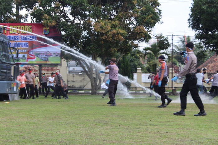 Lampung Tengah, Bangkitnusantara.com — Anggota Pelon Dalmas Inti Polres Lampung Tengah bersama tiga 3 Pleton Dalmas Kerangka dari 3 Rayon Polsek jajaran melaksanakan Simulasi Penangan Unjuk rasa Pembagian BLT (Bantuan Langsung Tunai) di Kampung Buyut Udik Kec. Gunung Sugih Lampung Tengah, Simulasi Dilaksanakan Dilapangan Polres lampung Tengah, Senin (27/07/2020).