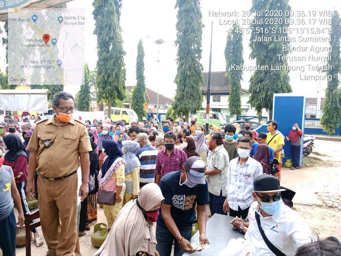 Lampung Tengah, Bangkitnusantara.com — Kapolsek Terusan Nunyai Iptu Iptu Santoso, S.Pd Bersama Dinas Perdangan Lampung Tengah Melinda Sari (Kasi Info Dinas perdagangan) Melaksanakan Operasi Pasar Murah Khusus Gas LPG 3 Kg Bertempat di Balai Kampung Bandar Agung Kecamatan Terusan Nunyai Lampung Tengah, Selasa (28/07/2020).
