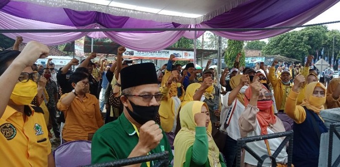 “Musa Ahmad, Bupati. Ardito Wijaya, Wakil Bupati. Lampung Tengah, Berjaya,” seru Mohammad Maksum diikuti ratusan simpatisan di pagar luar kantor KPU Lamteng, Sabtu (5/9/2020).