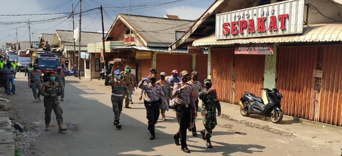 Petugas gabungan melakukan penyisiran bersamaan dengan memberikan himbauan kepada masyarakat untuk terus mematuhi protokol kesehatan sebagai upaya pencegahan Covid-19.