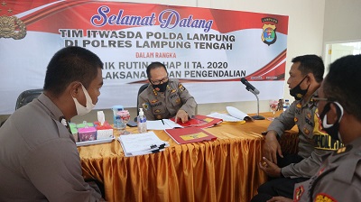 Lampung Tengah, Bangkitnusantara.com – Waka Polres Lampung Tengah Kompol Suparman, S.Pd, M.Si, Mewakili Kapolres Lampung Tengah AKBP Popon Ardianto Sunggoro, S.Ik., S.H menerima Tim Wasrik Itwasda Polda Lampung yang di yang dipimpin oleh Pengawas Tim A Kombes Drs Jauhari, di ruang Atmani Wedhana Polres Lampung Tengah, Rabu ( 21/10/2020).