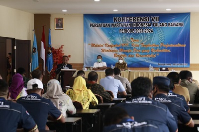 Tulang Bawang, Bangkitnusantara.com — Dr. (Cand) Hj. Winarti SE., MH. Menghadiri acara konferkab PWI yang Ke 7 dengan Tema “Melalui Konferkab VII, Kita Tingkatkan Profesionalisme Wartawan Menuju Pers Yang Berkualitas, Beretika dan Bermartabat” pada Senin 22 Februari 2021 Hotel Le Man Unit 2. Acara ini dihadiri Anggota Forkompimda plus, Pejabat Tinggi Pratama dilingkup Pemda Tuba, Ketua PWI prov. Lampung (Supriyadi Alfian), Ketua PWI kab.tuba (Abdul Rohman), Ketua MUI ( H.Yantori). Bupati didampingi Asisten 2 bid. Ekonomi dan Pembangunan, Kepala BPKAD, Kadis Kominfo, KadisPora dan Kabag Umum
