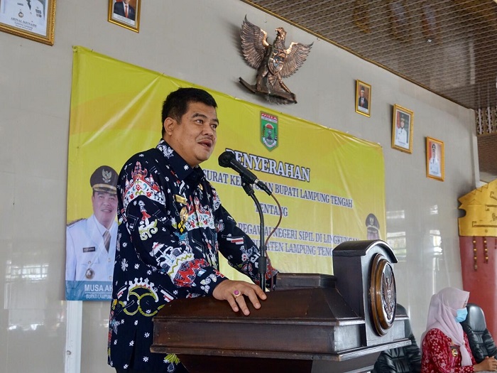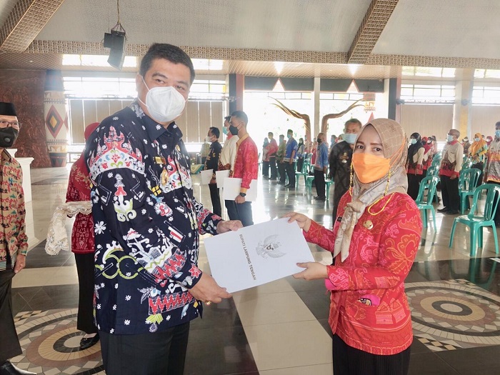 LAMPUNG TENGAH. Bangkitnusantara.com. — Menjadi abdi negara yang bertanggung jawab ,disiplin dan mengutamakan pelayanan kepada masyarakat adalah tugas utama dari Aparatur Sipil Negara. Demikian salah satu isi arahan Bupati Lampung Tengah Musa Ahmad dalam acara penyerahan SK kenaikan pangkat TMT 1 April 2021 bertempat di Gedung Sesat Agung Nuwo Balak Kabupaten Lampung Tengah. (06 /05/2021) .