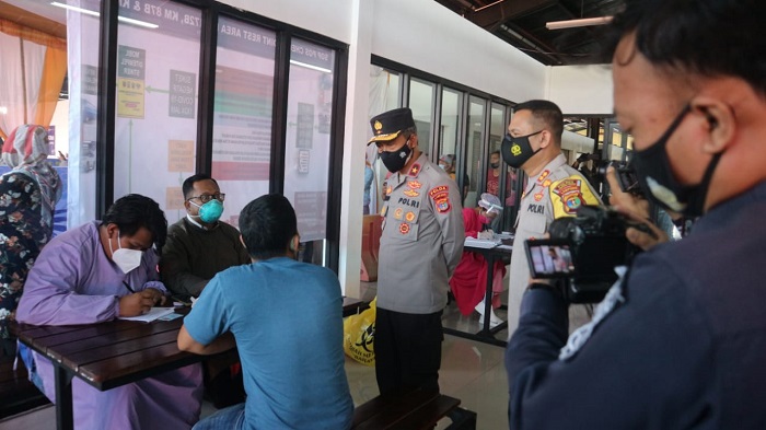 Waka Polda Lampung meninjau langsung kegiatan yang dilaksanakan oleh Polres Lampung Tengah beserta instansi terkait dalam penyekatan kendaraan dan meninjau proses pemeriksaan test swab terhadap masyarakat yang disediakan di ruang test Rest Area KM 172 B Lambu Kibang Lampung Tengah.