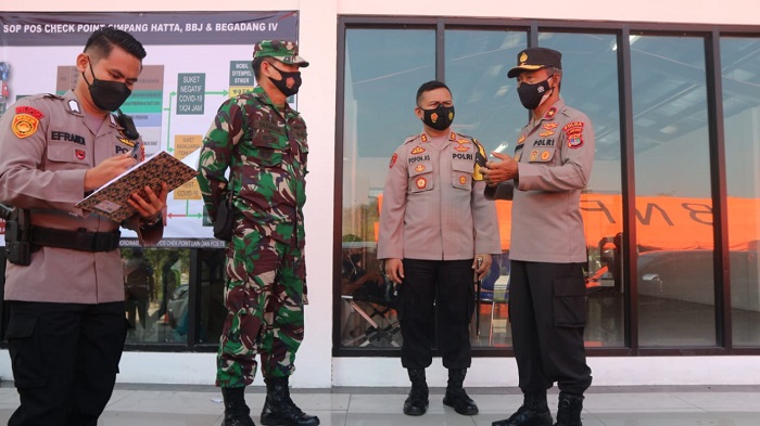 LAMPUNG TENGAH. Bangkitnusantara.com. — Kapolres Lampung Tengah AKBP Popon Ardianto Sunggoro, S.Ik., S.H. mendampingi Waka Polda Lampung Brigjen Pol Drs. Subiyanto yang turun kelapangan meninjau pos penyekatan rest area 172 B Lambu Kibang Lampung Tengah, pasca lebaran Idul Fitri 1442 H, Selasa (19/5/2021) Jam 10.00 WIB.
