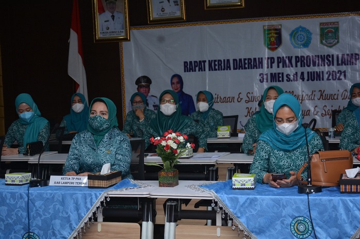 LAMPUNG TENGAH. Bangkitnusantara.com. — Ketua Tim Penggerak PKK Kabupaten Lampung Tengah Ny. Mardiana Musa Ahmad menghadiri Penutupan Rapat Kerja Daerah (Rakerda) Tim Penggerak PKK Provinsi Lampung bersama Wakil Ketua 1 Tim Penggerak PKK Kabupaten Lampung Tengah Ny. Indria Ardito Wijaya dan Wakil Ketua 2 Tim Penggerak PKK Kabupaten Lampung Tengah Ny. Yulita Nirlan beserta jajaran Tim Penggerak PKK Kabupaten Lampung Tengah di Ruang Rapat Beguwai Jejamo Wawai, Jum’at (4/6/2021).