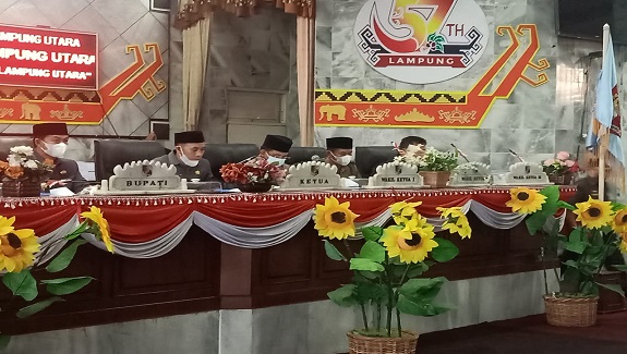 Dipimpin langsung oleh Ketua DPRD Kabupaten Lampung Utara, Romli, A.Md bersama Wakil Ketua I Madri Daud, SE.,MH, Wakil Ketua I, H. Dedi Sumirat, dan Wakil Ketua III Joni Saputra dan Anggota DPRD Kabupaten Lampung Utara. Sidang Paripurna juga dihadiri oleh Bupati Lampung Utara, H. Budi Utomo, SE.,MM, Kapolres Lampung Utara yang diwakili oleh Kabag Ops, Kompol Hadi Sutomo, KaKimal Lampung Utara Letkol Laut PM M. Firdaus, SH.,MH, Sekdakab Lampung Utara, Drs. H. Lekok, MM dan jajaran Pejabat di lingkungan Pemerintah Daerah Kabupaten Lampung Utara.
