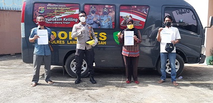 Jumlah Vaksin yang tersedia / digunakan: 400 Dosis ( Vaksin Polri) untuk 400 Orang (Target Harian) serta kendaraan yang digunakan R4 Abulance Dokes Polres Lampung Tengah yang dimodifikasi Gerai Vaksinasi Covid-19 Keliling, serta R6 BUS Polres lampung Tengah yang dimodifikasi Gerai Vaksinasi Covid-19 Keliling.
