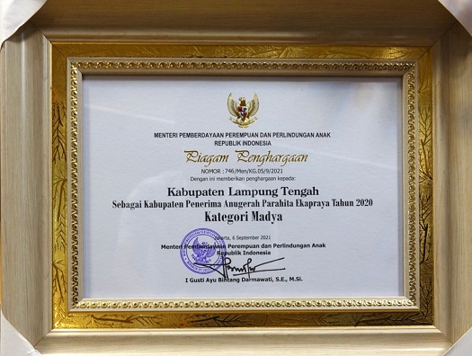 Prestasi yang diraih tersebut meningkat dari tahun sebelumnya yang mendapatkan predikat “ Pratama “, ujar Kepala Dinas PP & PA Lampung Tengah Nuliana, SH.,MH , pada hari Jumat 24 September 2021 langsung hadir dalam penyerahan Piagam dan Trofi APE 2021 di Ruang Sakai Sambayan Komplek Perkantoran Gubernur Provinsi Lampung yang langsung di serahkan oleh Sekertaris Daerah Provinsi Lampung Fahriza Darminto. Penghargaan ini diberikan kepada Kementrian / Lembaga dan Pemerintah Daerah sebagai bentuk pengakuan atas komitmen dan peran serta para pimpinan dalam upaya mewujudkan Kesetaraan gender dalam pelaksanaan strategi pengarusutamaan gender ( PUG ).