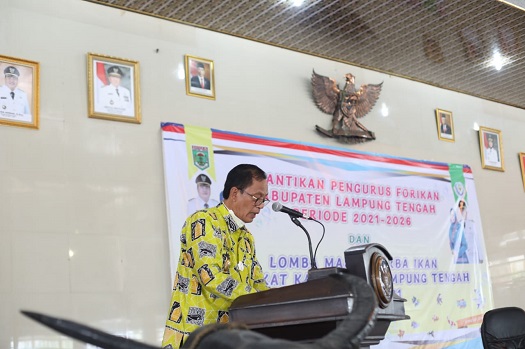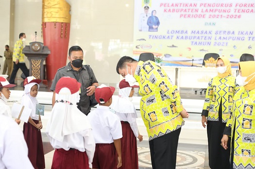 LAMPUNG TENGAH.Bangkitnusantara.com. — Bupati Lampung Tengah Musa Ahmad mengukuhkan Ketua Forikan ( Forum Peningkatan Konsumsi Ikan Nasional ) Kabupaten Lampung Tengah ( Lamteng ) Mardiana Musa Ahmad beserta Jajaran Pengurus pada acara Pengukuhan Forikan Kabupaten Lamteng Periode 2021 – 2026 dan Lomba Masak Serba Ikan yang ikuti oleh 28 kecamatan, bertempat di Sesat Agung, Nuwo Balak, Selasa ( 23/11/2021 ).