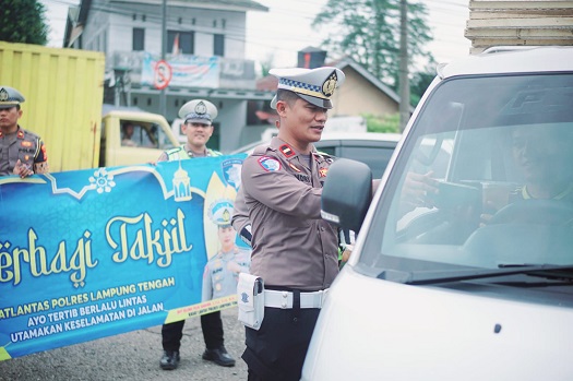 Kehadiran anggota Satuan Lalu Lintas (Satlantas) bukan untuk melakukan razia atau penindakan pelanggaran. Sebaliknya, mereka membagikan paket takjil kepada para pengendara roda dua maupun roda empat yang masih berada di perjalanan menjelang azan Magrib.
